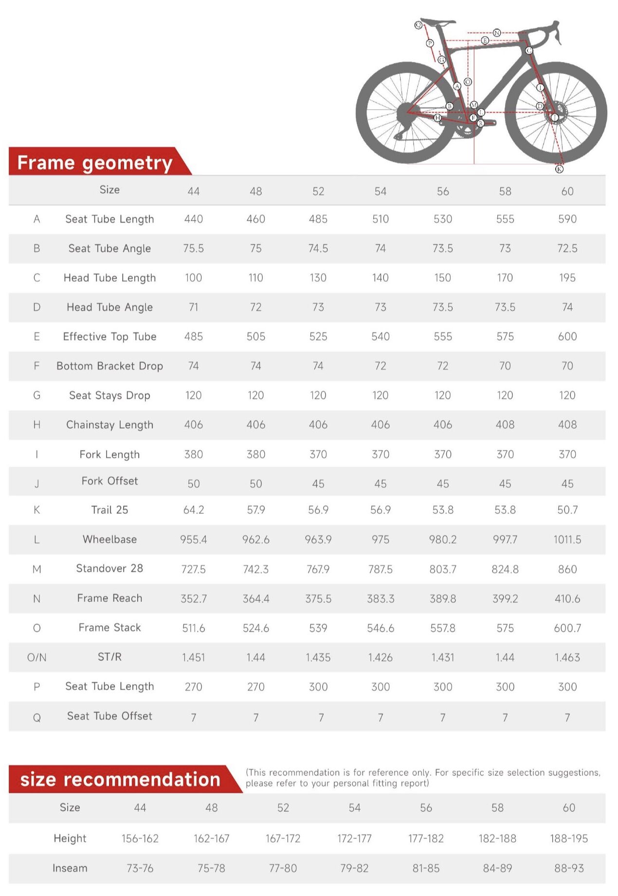 Frame Size: 44 / 48 / 52 / 54 / 56 / 58 / 60