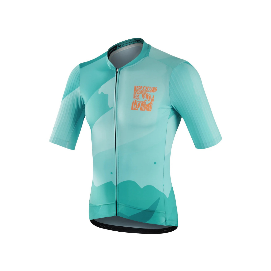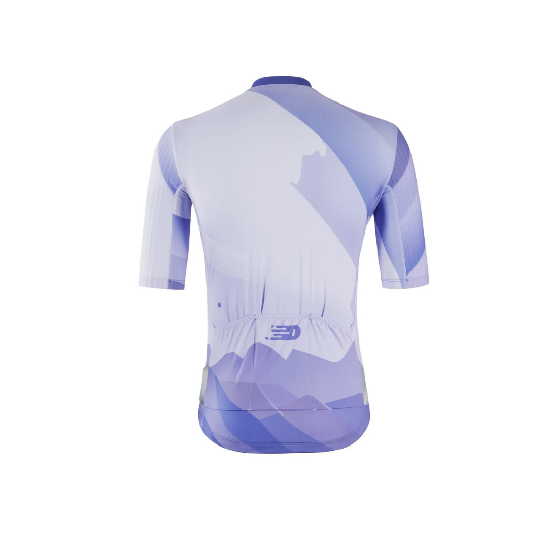 Features a macaroon-hued landscape print, this pro cycling jersey is built for optimal performance.  Main body made of Italian milk silk fabric that wicks moisture and aero sleeves in raised striped fabric maximize airflow, smooth YKK self-locking zipper and non-slip gripper at hem keep the jersey in the best position while you ride, ensuring all-day comfort. The classic three rear pockets with reinforced patches provide practicality for long-distance riding.